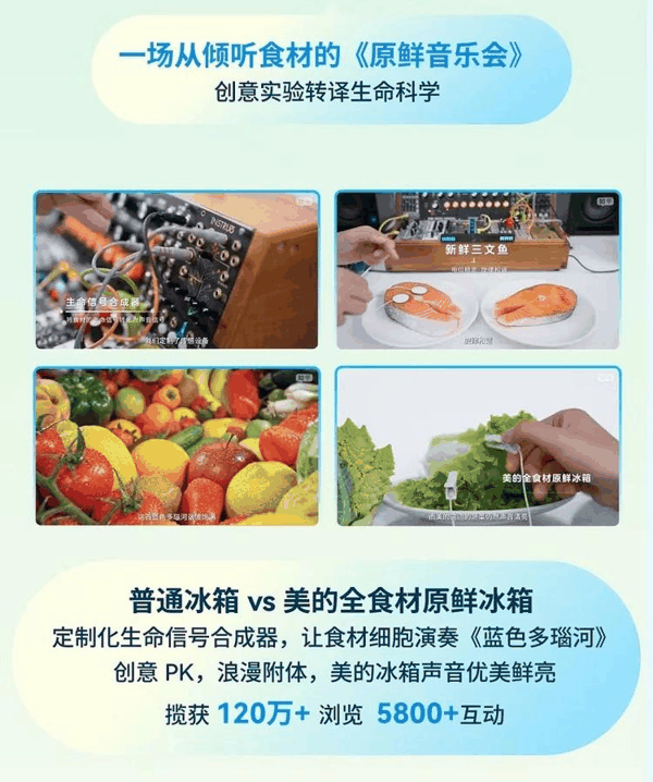 美的做了一场用食物取材的《原鲜音乐会》。普通冰箱和美的全食材原鲜冰箱做对比,不再只是列参数、放数据,而是用生命信号合成器把食材状态转成音乐,让食材细胞去“演奏”《蓝色多瑙河》。