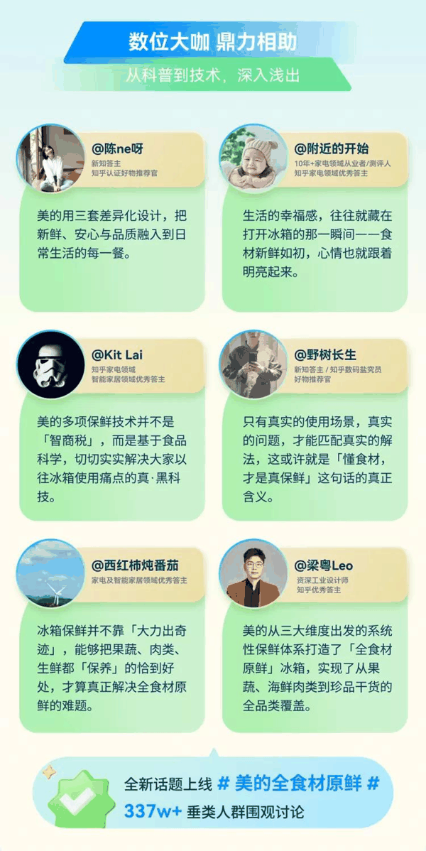 首先,在知乎上掀起一波讨论,提出一系列普通人选购或使用冰箱时真正关心的问题:两三天内要吃的肉,到底该冷藏还是冷冻?为什么普通冷冻解冻后肉会变柴?从果蔬到海鲜肉类再到珍品干货,冰箱到底怎么才能做到全食材原鲜?那些听上去很厉害的保鲜技术,到底是黑科技,还是智商税?