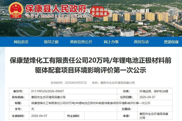 近日,湖北省襄阳市生态环境局保康分局发布“保康楚烽化工有限责任公司20万吨/年锂电池正极材料前驱体配套项目环境影响评价第一次公示”信息。