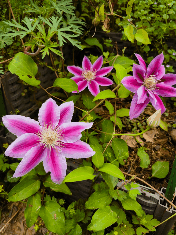 铁线莲的 园艺价值很高 ,明末清初诗人彭孙贻的“蕤宾为蒂锻为胎,百炼芙蕖火宅来;似逐旌阳仙树发,轻浮海港铁莲开;白毫叶叶光生座,素步盈盈迹印苔;采得若邪春一线,干将抱蕊棹歌回”、清朝诗人樊增祥的“跗萼细牵墨线,花心双套瑶卮”的描述均写出了铁线莲美妙的姿态。 铁线莲的其他植物学特征如下:茎具六条纵纹,节部膨大,被稀疏短柔毛;二回三出复叶,叶片顶端钝尖,基部圆形或阔楔形,全缘;花单生叶腋, 萼片6枚,甚至更多 ,颜色丰富,有白、红、紫、黄、蓝以及复色等;萼片倒卵圆形或匙形,密被绒毛;雄蕊紫红色,花柱短,柱头膨大成头状(植物描述参考中国植物志)。