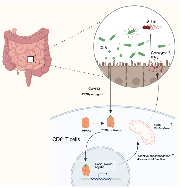 近日,中国农业科学院上海兽医研究所揭示了肠道菌群代谢物共轭亚油酸通过调控免疫细胞代谢,增强宿主抗沙门菌感染能力。相关研究成果发表于《肠道微生物》 ( Gut Microbes ) 。