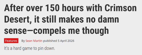 和发售前解禁的媒体评分不同,这几天陆续有一批媒体发表了他们的长时间游玩感受。其中PC Gamer的评论尤为典型:《150小时后我仍然看不懂红色沙漠——但它却奇怪地让我着迷》,编辑在文章里吐槽了非常多地方,同时却也表示“停不下来”。150小时的投入,只来得及让编辑充分体验了五个区域中的两个。