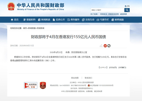 中新网 4月15日电 据财政部网站消息,根据有关工作安排,财政部将于4月22日在香港特别行政区发行2026年第二期人民币国债,发行规模为155亿元,具体发行安排将在香港金融管理局债务工具中央结算系统(CMU)公布。