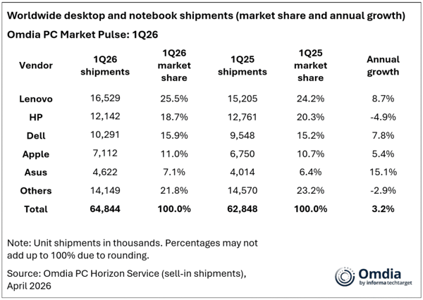 4月9日知名数据调研公司Omdia正式发布了,2026年第一季度全球PC市场调研报告。报告称在过去的第一季度全球PC整体出货量为6480万台,同比增长3.2%。