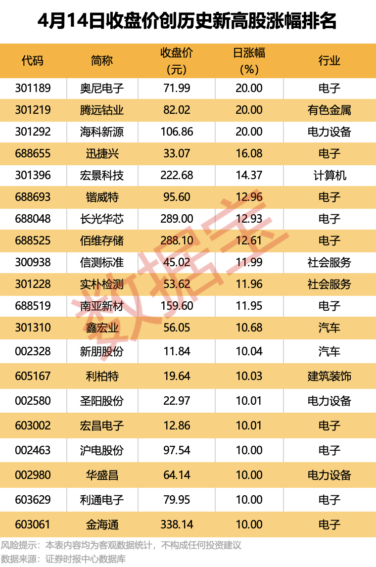 收盘价创 历史新高 股中,今日股价平均上涨6.8%,涨停的有 奥尼电子 、 腾远钴业 、 海科新源 等,涨幅居前的有 迅捷兴 、 宏景科技 、 锴威特 等。