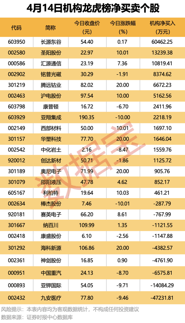 今日龙虎榜中,净买入个股为15只,净卖出的个股为9只。12股净买入金额均超千万元, 长源东谷 获机构净买入6.05亿元,居首。 圣阳股份 和 汇源通信 机构净买入金额均超1亿元。