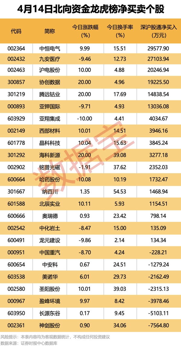 今日龙虎榜现身个股中,17股获北向资金净买入,其中6股净买入金额均超1亿元。 中恒电气 、 九安医疗 、 沪电股份 获净买入均超2亿元; 协创数据 、 腾远钴业 、 亚钾国际 获北向资金净买入均超1亿元。