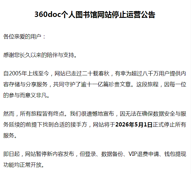 IT之家 4 月 7 日消息,360doc 个人图书馆网站 4 月 1 日发布停止运营公告,因无法在确保数据安全与服务延续的前提下找到合适的接手方, 网站将于 2026 年 5 月 1 日正式停止所有服务 。