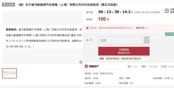起拍价仅100元!威马汽车近1.3亿元债权,9.35万元成交