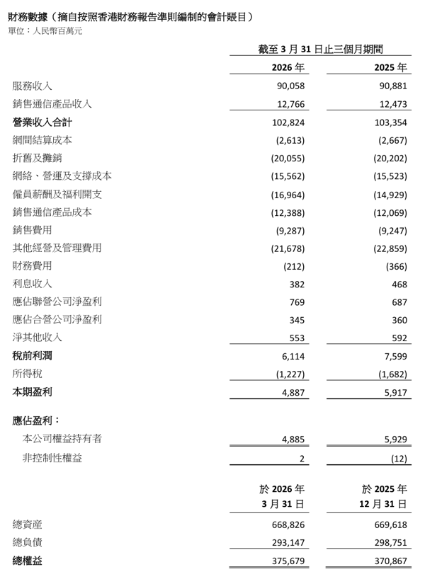 中国联通2026年第一季度净利润49亿元,同比下降17.6%