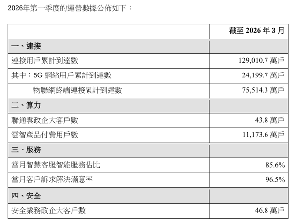 2026 年第一季度,中国联通算力业务收入人民币 154 亿元,同比增长 8.3%,其中智算中心收入同比提升 11.7%,联通云服务近 44 万政企大客户。云智产品付费用户超过 1.1 亿户,净增 549 万户。