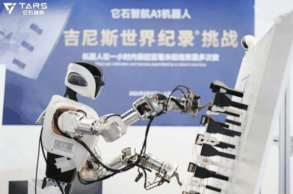 在基于真实工业线束场景1:1复刻的测试环境中,搭载了自研通用具身大模型AWE3.0的A1机器人,在60分钟的连续作业中,重复完成了百余次柔性线束的完整精密装配任务,获得“机器人在一小时内装配亚毫米级线束最多次数”吉尼斯世界纪录。