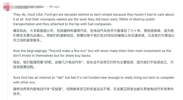 还是拿福特举例,有网友认为它也就是象征性地研发电车,投入的资金很少。