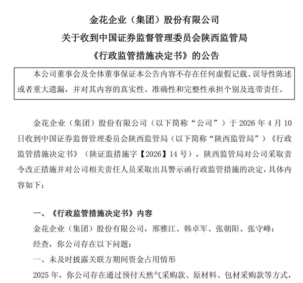 4月10日晚间, 金花股份 (SH600080,股价8.94元,市值33.37亿元)公告称,公司收到陕西证监局《行政监管措施决定书》和上海证券交易所纪律处分决定书。监管认定, 金花股份 存在“未及时披露关联方期间资金占用”“财务核算不规范”的违规行为。