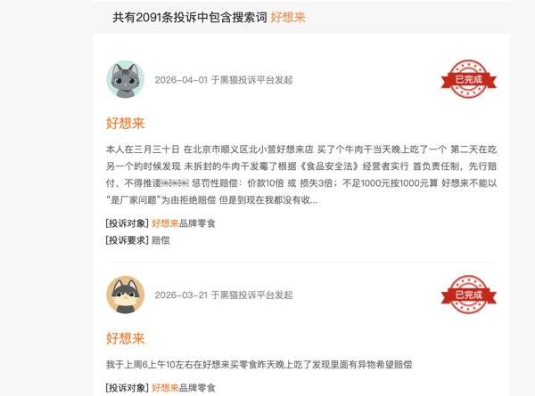 黑猫投诉平台上,关于好想来的投诉有2091条,其中大多数也为产品发霉、变质、吃出异物等 食品安全 问题。