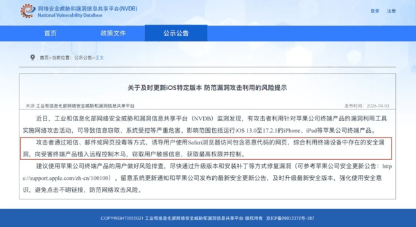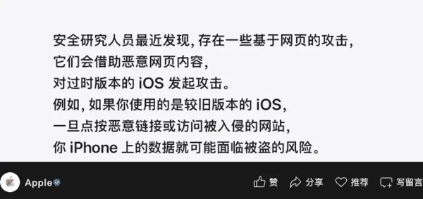 内容也很简单,就是旧版本的iOS存在安全漏洞,一旦点到恶意链接,iPhone上的数据就可能面临被盗的风险。