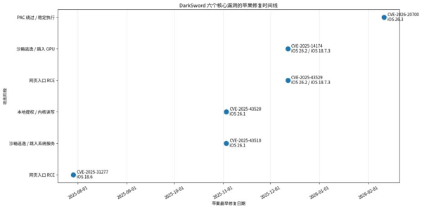就这样一路修到了12月,即使是案例里没用到的第6个漏洞,也在今年2月份的iOS 26.3上补齐了。
