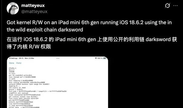 就在今年3月份,还有网友展示如何盗取老设备的权限,其中用到的正是已经公开的DarkSwrod漏洞链,而运行的系统也是没被补丁覆盖的iOS 18.6.2。