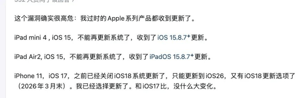 虽然补丁打的基本都差不多了,但毕竟苹果系统跨度大,产品多,所以这次的iOS 26.4.1和iOS 18.7.7更像是个整合包,新版本升级的同时,顺便一并回补给更多留在iOS 18的老设备。