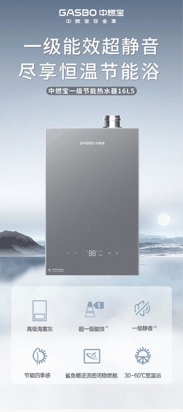 中燃宝一级节能热水器16L5,98%超一级能效,以一级节能为核心优势,通过更高效的燃烧结构与换热技术,大幅提升热能利用率,从源头减少燃气浪费。它让舒适沐浴不再有负担,真正实现“用得爽、花得少”,把节能做到日常可见。