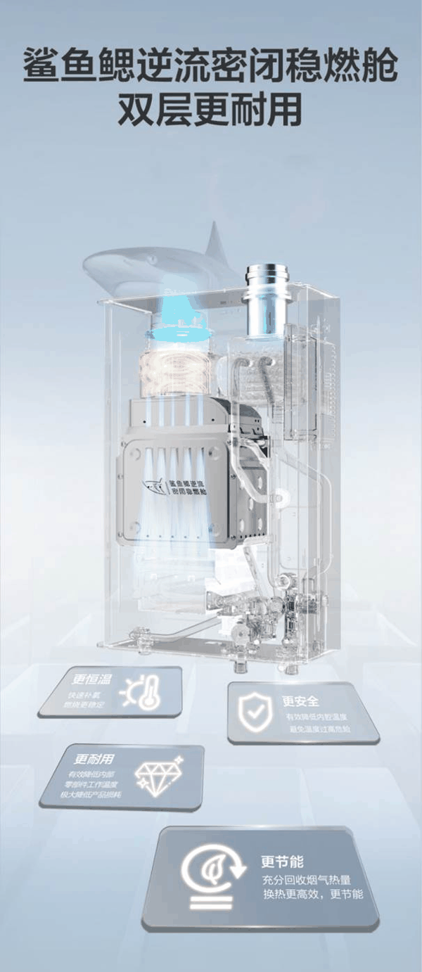 9管同时进水加热,换热面积大幅提升,加热更快更省气,彻底告别燃气浪费;双密封结构,稳固耐用无漏水隐患;全密闭结构有效减少管路共振,运行更稳定;同时将排烟温度降低5℃,换热效率再升级,从省气、水量、耐用、安全四大维度,全面碾压普通冷凝换热器,为家庭打造更节能、更舒适、更安心的热水生活。