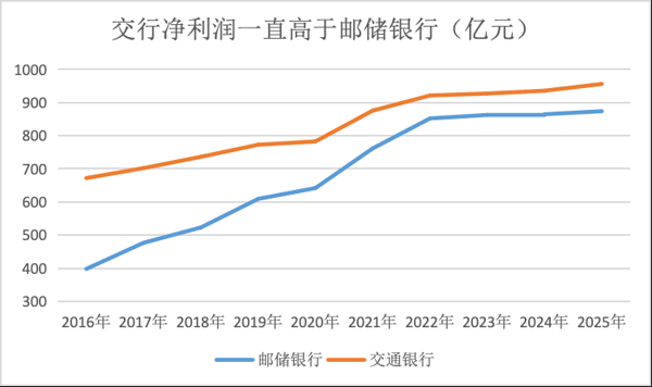 根据会计准则,储蓄代理费计入业务及管理费,冲减当期利润。这也导致邮储银行虽然营收超过交通银行,但净利润仍低于交通银行。财报数据显示,2025年交通银行净利润956亿元,高出邮储银行近百亿元。