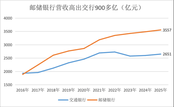 从营收看,邮储银行的营业收入在2017年已超过交通银行,此后这一差距持续扩大。2025年邮储银行营业收入达到3557亿元,高出交通银行900多亿元。