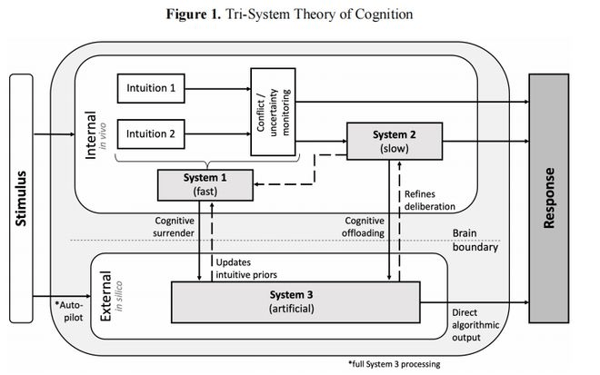 传统认知只有系统1(直觉)和系统2(审慎思考),现在AI成了系统3,一个在大脑之外运行的「外接认知系统」。