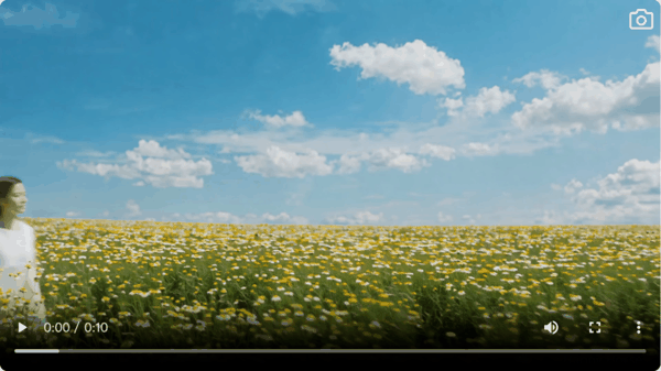 举个具体的例子,我们用的提示词是一个穿着白色裙子的女生走在花海里,从画面的左边走到右边,镜头跟随,女生转动裙子,捧起一朵花闻。