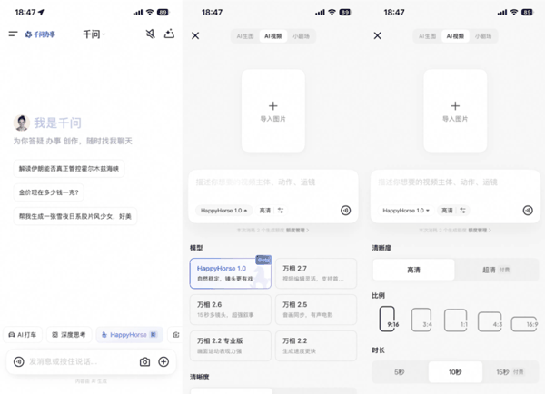 移动端(千问 APP) ,我们只需将千问更新到最新版本,通过点击首页的「HappyHorse」胶囊,即可直接进入 HappyHorse 1.0 的生视频创作面板,并且千问还赠送了免费体验额度。