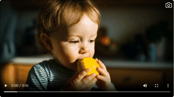 动作有层次感,人物的表情同样真实。我们生成了一个小朋友咬下酸柠檬的视频,从咬下柠檬的瞬间,到强烈的酸味,开始带来面部肌肉紧绷、五官皱起、紧闭双眼,再到酸劲儿逐渐过去,面部肌肉慢慢放松,最后茫然地重新睁大眼睛。
