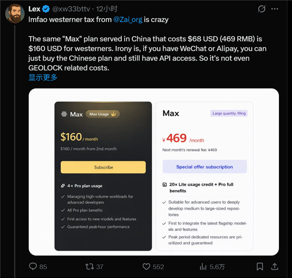 有一位国外网友直接吐槽起这种国内外不同的定价,表示同样的Max套餐, 中国用户的费用是469元每月,也就是68美元每月,而海外用户则要160美元每月,贵了一倍还多。