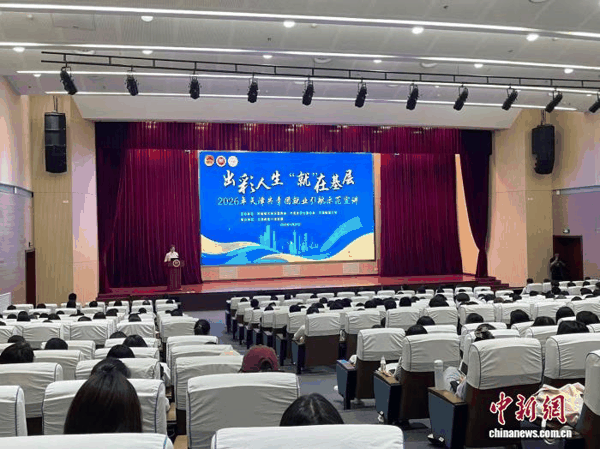 中新网 天津4月25日电 (江莹)24日下午,“出彩人生‘就’在基层”2026年天津共青团就业引航示范宣讲暨共青团促进大学生就业专场招聘会在天津师范大学举行。来自6所高校的400余名青年学子到场,100余家用人单位携优质岗位现场揽才,通过“榜样宣讲+岗位对接”双轨模式,把政策、指导与岗位一站式送到毕业生身边。