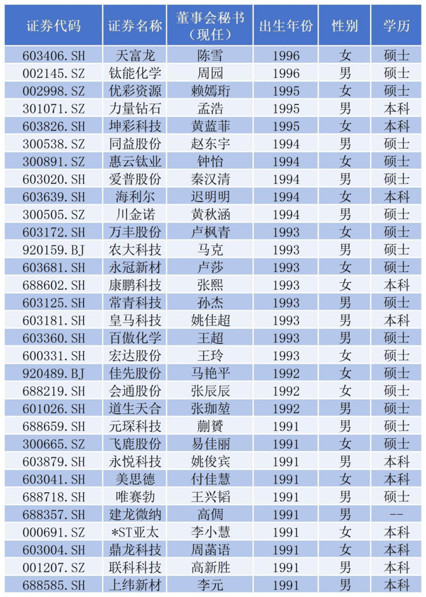最年长的回天新材董秘67岁,从公司上市就一直干,任职超10年,行业经验丰富;最年轻的天富龙董秘才30岁,是材料学硕士,之前在券商做过研究员,擅长和机构沟通。