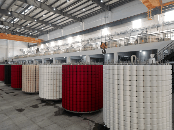 公司投入巨资联合高校研发AI印染控制系统,建成从松筒、染色到打包、入库的全流程自动化闭环,通过桁架机械手、AGV自动导引车搭建立体物流网,实现筒子纱全程“不落地”生产,无人工搬运周转。