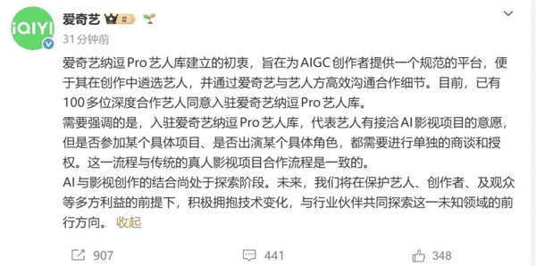 爱奇艺再回应AI艺人库,重申立场及核心理念:会继续坚持三件事