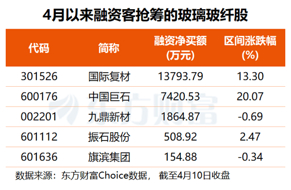 从资金角度看, 东方财富 Choice数据显示,本月共有5只玻璃玻纤股获得融资净买入, 国际复材 获杠杆资金加仓1.38亿元,中国巨石、 九鼎新材 分别获融资客抢筹7421万和1865万元, 振石股份 融资净买额也在500万元以上。