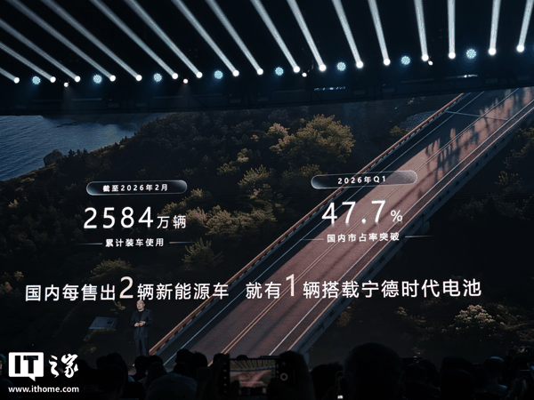 IT之家 4 月 21 日消息,在今天晚间的宁德时代 2026 年超级科技日发布会上,宁德时代首席技术官高焕宣布:截至 2026 年 2 月份,搭载宁德时代动力电池的新能源车 已经突破了 2580 万辆 。