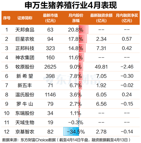 A股方面,虽然近期猪肉价格持续走低,但 生猪养殖 板块个股已率先迎来反弹。 东方财富 Choice数据显示,截至4月14日午盘,申万 生猪养殖 行业12只成份股中11只当月股价上涨,仅 京基智农 1股下跌。上涨个股中, 天邦食品 涨幅最大,月内上涨20.8%; 巨星农牧 、 正邦科技 、 神农集团 涨幅居前,均涨超10%。