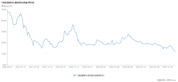 现货方面,据农业农村部信息中心和山东 卓创资讯 股份有限公司联合监测,2026年第15周(即2026年4月7日—4月10日),16省(直辖市)瘦肉型白条猪肉出厂价格总指数的周平均值为每公斤12.24元,环比下跌3.9%,同比下跌35.9%,较上周跌幅扩大2.0个百分点。
