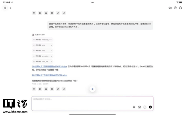所以我尝试将我的工作流交给天禧 Claw,先给他下达指令:我是一名新媒体编辑,帮我抓取今天科技圈最新热点,过滤掉相似题材,然后筛选其中热度最高的前 20 条,整理成 Excel 文档,保存到 Download 文件夹下。