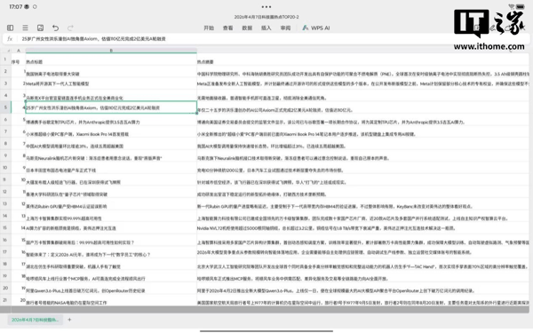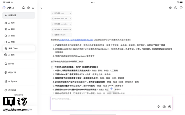 天禧 Claw 很快就整理出了当天的科技圈热点的前 20 条,并生成了 Excel 文档。