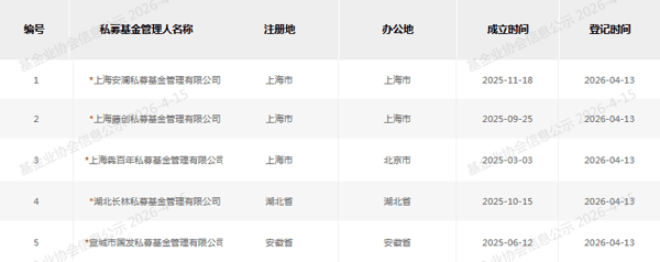 根据协会信息,4月13日完成的登记的5家私募管理人分别是上海安澜私募基金管理有限公司(以下称安澜私募)、上海藤创私募基金管理有限公司(以下称藤创私募)、上海犇百年私募基金管理有限公司(以下称犇百年私募)、湖北长林私募基金有限公司、宣城市国发私募基金管理有限公司。