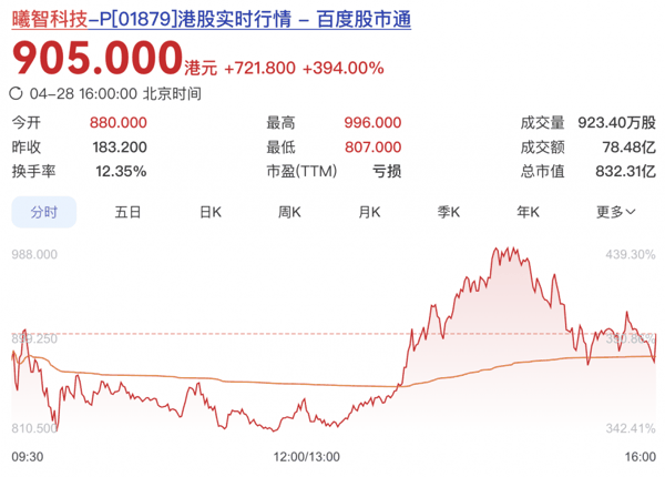 截至4月28日收盘,曦智科技涨394%,股价905.0港元/股,总市值832.31亿港元。
