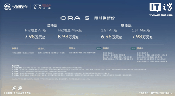 IT之家 4 月 25 日消息,正在举行的 2026 北京车展上,长城汽车欧拉 5 燃油版、混动版车型迎来上市,售价 7.98 万元起,限时换新价 6.98 万元起。