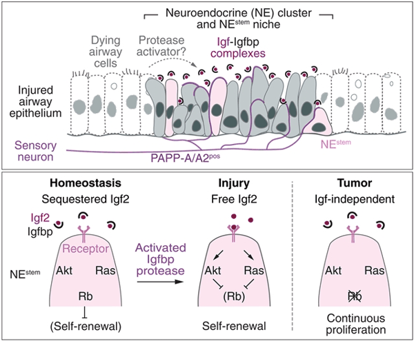 Abstract: Stem cells proliferate after injury to repair damaged tissue, and chronic injury can promote cancer. However, the injury-activated signals and regulatory mechanisms, and their relationship to cancer, are poorly understood. Here, we identified insulin-like growth factor 2 (Igf2) as an injury-activated mitogen for lung neuroendocrine stem cells, which are facultative airway progenitors and a cell of origin of small-cell lung cancer in mice. Igf2 was constitutively produced by the stem cells but sequestered in the niche by coexpressed Igf binding proteins (Igfbps). Airway injury released Igf2 and induced proliferation by transiently activating Igf2 receptors and repressing retinoblastoma (Rb) tumor suppressor. Permanent pathway activation by Rb deletion initiated continuous stem cell division. Thus, beyond their classical hormonal roles in physiology, growth, and aging, Igf proteins operate locally and rapidly with Igfbp and Rb to control injury-induced stem cell proliferation and tumor initiation.