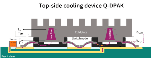 图3:不同功率封装的功率回路电感对比 诸如Q-DPAK等TSC封装还具备一项显著优势,即可在封装顶部直接连接散热器或液冷系统。 这种设计将散热路径与电气路径分离,从而提升散热效率,并降低热阻。借助TSC技术,功率器件和栅极驱动器可以布置在PCB的同一侧,其中,栅极驱动器在理想情况下位于底部。相比之下,器件的散热器则位于顶部,从而为设计提供更大灵活性和系统级集成度。