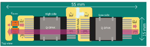 I-Loop开关单元 是一种标准设计,其中MOSFET安装在PCB底面,其余器件位于PCB顶面。这种配置虽然适用于许多应用,但在最大限度地降低寄生电感方面,存在一定局限,特别是在高频系统中。