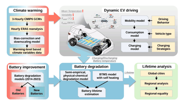 “这些现象引发我们思考:在未来日益频繁的极端热浪下,电动汽车车主是否需要更频繁地更换电池?当前的电池技术是否足以抵御日益加剧的升温事件?”吴浩驰说,带着这些思考,当时还在浙江大学读博的他,与合作者一起构建了一套多模型耦合框架,将电动车行驶模型、电池热管理模型与全球300座主要城市的高精度气候预测数据相融合,希望填补这一“气候变化影响与电池设计耐受度”的研究空白。