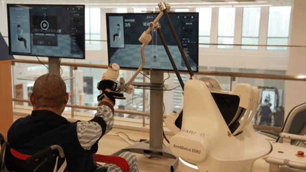 在神经康复中心物理治疗区,三维上肢康复机器人正在帮助患者进行训练。这台机器人能同时提供被动、助力、主动、抗阻四种不同训练模式,为上肢功能障碍患者提供丰富的上肢运动训练轨迹,帮助他们在三维空间内进行上肢运动控制和日常生活能力训练。